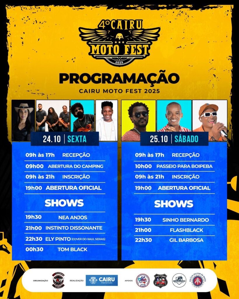 Cairu se prepara para acelerar as emoções com a chegada do 4º Cairu Motofest, que acontecerá entre os dias 24 e 26 de outubro. O evento, já tradicional no calendário cultural e turístico do município, promete reunir motociclistas, motoclubes, moradores e visitantes de diversas partes da Bahia e do Brasil em um grande encontro de liberdade, música, cultura e confraternização.
