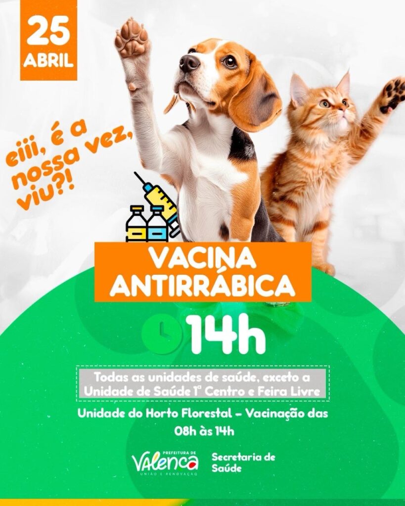 Na próxima sexta-feira (25), a Prefeitura de Valença, por meio da Secretaria de Saúde, vai promover mais uma importante ação de vacinação antirrábica para cães e gatos.
